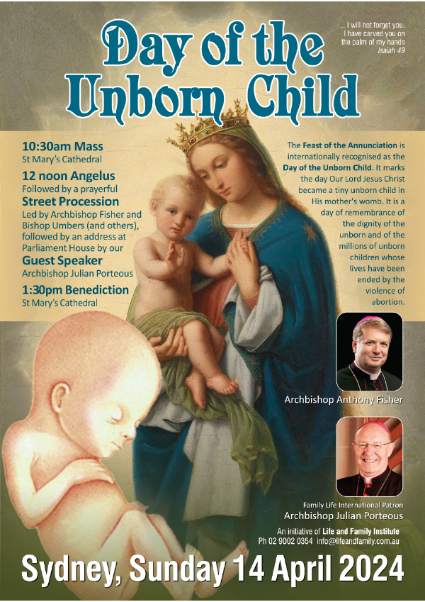 | Dear Supporters, Of interest to all of you will be this Sunday’s “Day of the Unborn Child”. Details are below: Procession for the Day of the Unborn A Procession for the Day of the Unborn Child will be held in Sydney CBD. This occasion marks the day Jesus Christ was conceived in his mother’s womb, and is a reminder of the unborn children who are not granted the right to life. When: 12pm this Sunday, 14 April Where: St. Mary’s Cathedral, Sydney After Mass at 10:30am, the Angelus will be recited at 12:00pm, followed by a prayerful street procession led by Archbishop Fisher, including an address at Parliament House by special guest speaker, Archbishop Julian Porteous.1:30pm Benediction at St. Mary’s Cathedral For more information visit www.lifeandfamily.com.au Sincerely, Right to Life |