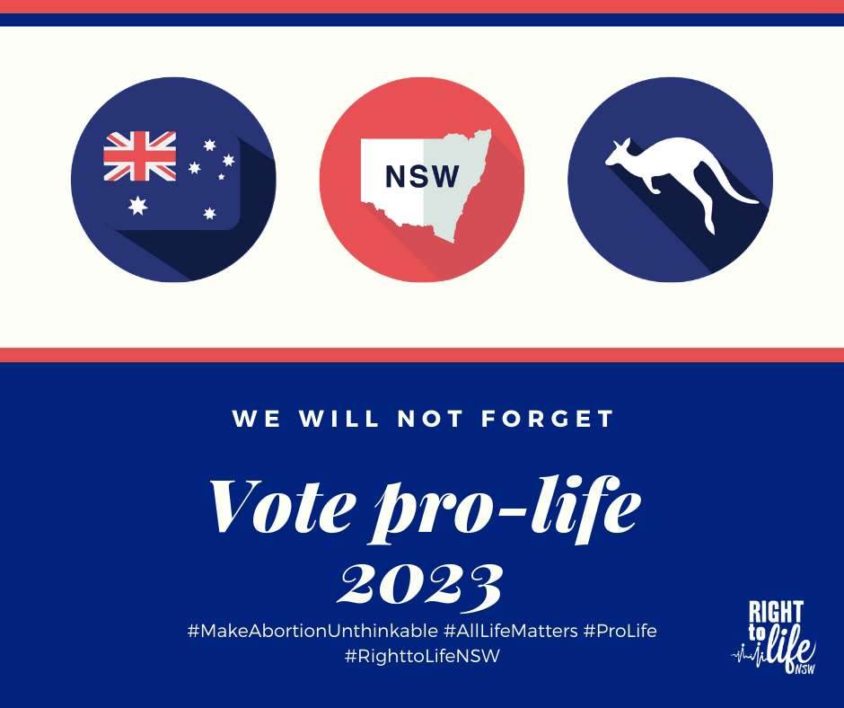 Right to Life has also initiated a “Vote Pro-Life 2023 Campaign” with the theme “we will not forget” – see our Facebook for regular updates on Monday mornings. Look out for our next email where we will be announcing our (rescheduled) Bubbles for Babies event which will officially launch this campaign.