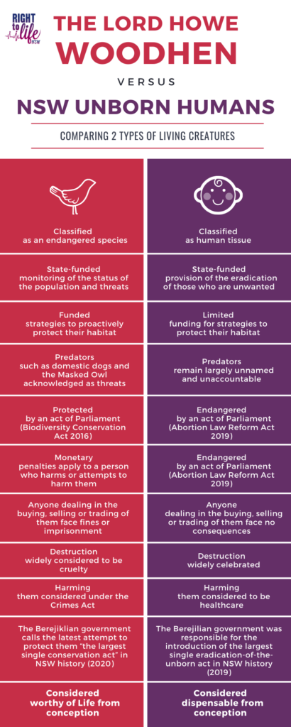 This gentleman was telling me how he visited Lord Howe Island recently and was struck by how the Lord Howe Woodhen is protected while our unborn are not.